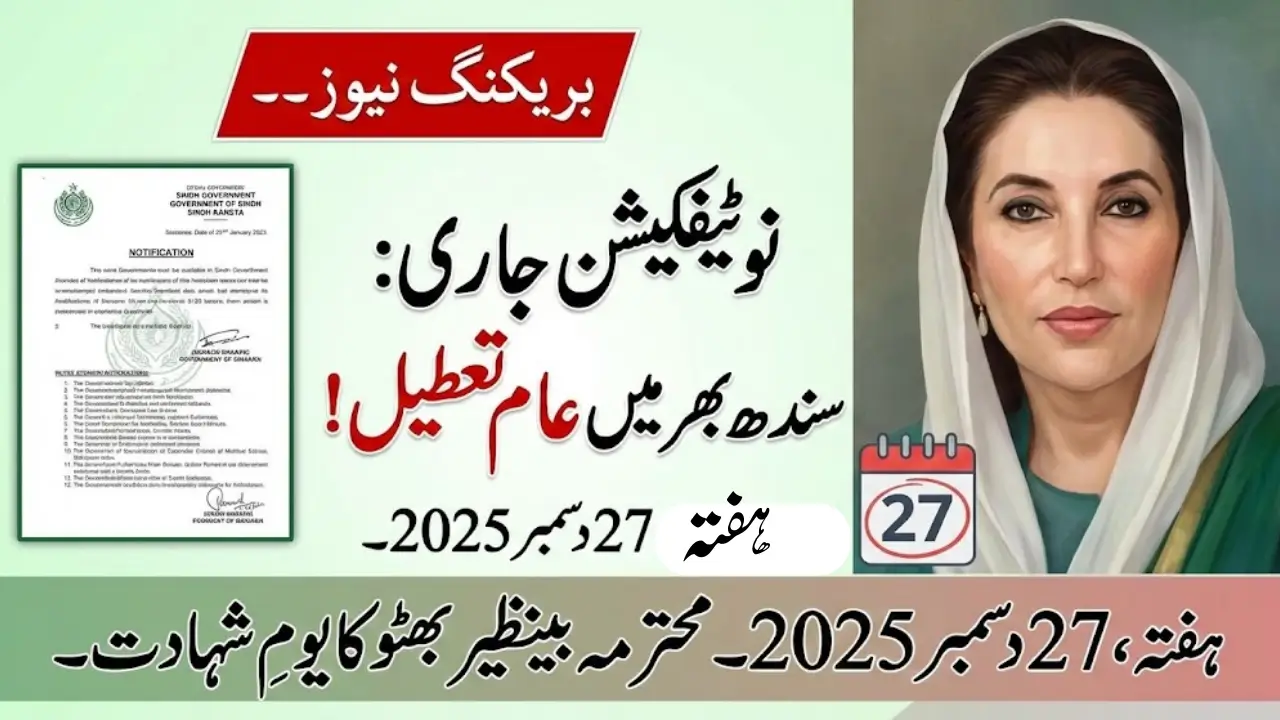 The Sindh government has issued a formal notification declaring a holiday across Sindh on Saturday, December 27, 2025, on the occasion of the eighth death anniversary of Prime Minister and Chairperson of the Pakistan People’s Party Benazir Bhutto. The notification issued by the Sindh government states that all government institutions across Sindh will remain closed…